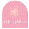 Pink background with a yellow firework illustration, and white text that says "get to gather" and "party services."